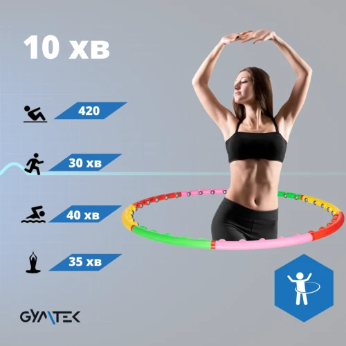 Обруч — масажер від Gymtek, це фітнес-аксесуар для тренування м'язів преса. Хулахуп ідеально підходить для корекції фігури, оскільки тренування з ним прості та ефективні. Регулярні заняття з легкістю допоможуть вам позбутися зайвого об'єму та жирової тканини в зоні талії, що істотно поліпшить настрій та самопочуття. Ефект від вправ хулахупом — пружне тіло, міцні м'язи, швидке спалювання жиру та поліпшення загального стану організму.